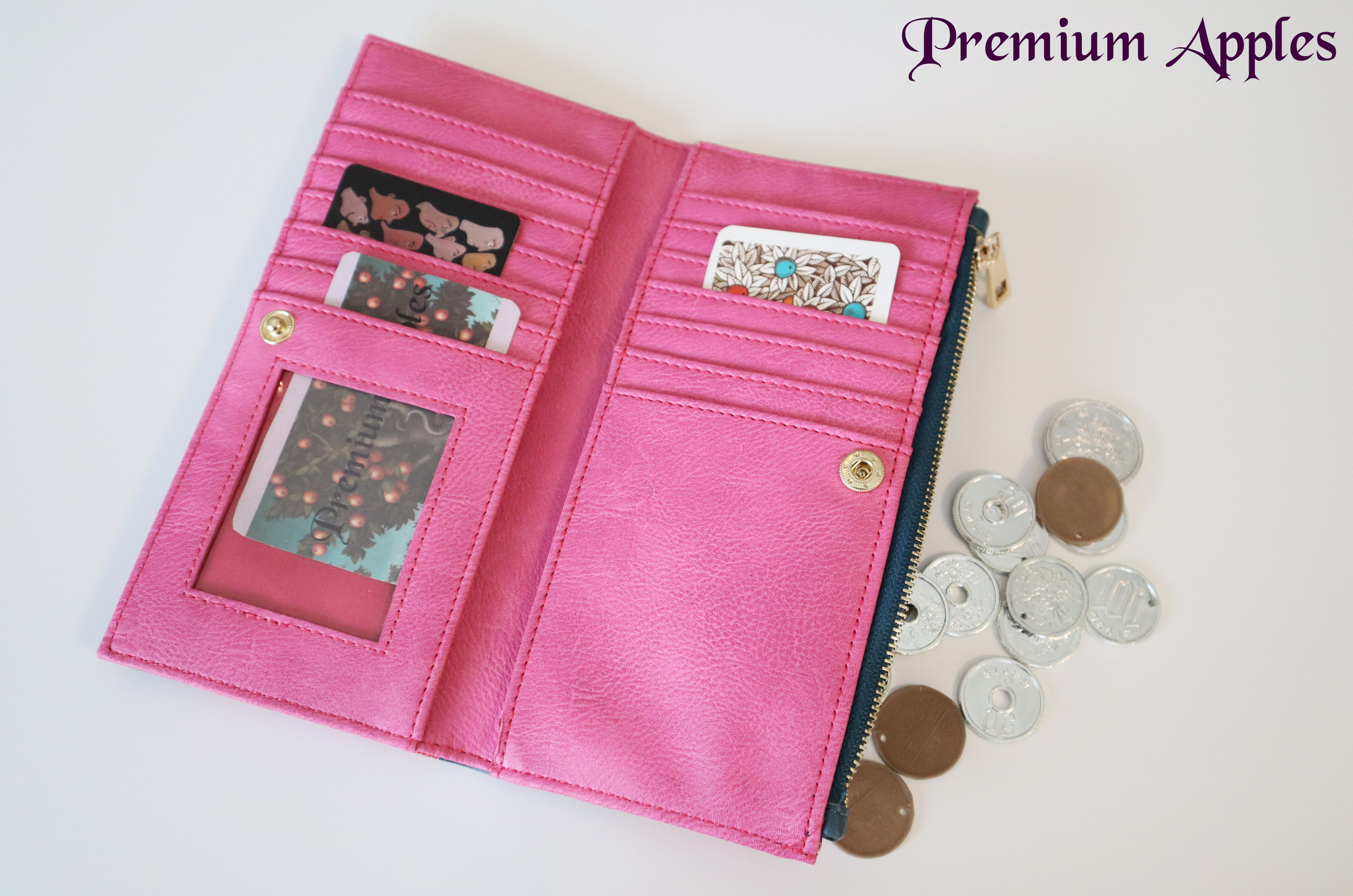 ピンクのカラーリングの内側には14のカード入れ、小銭入れ、2つのポケット付き。