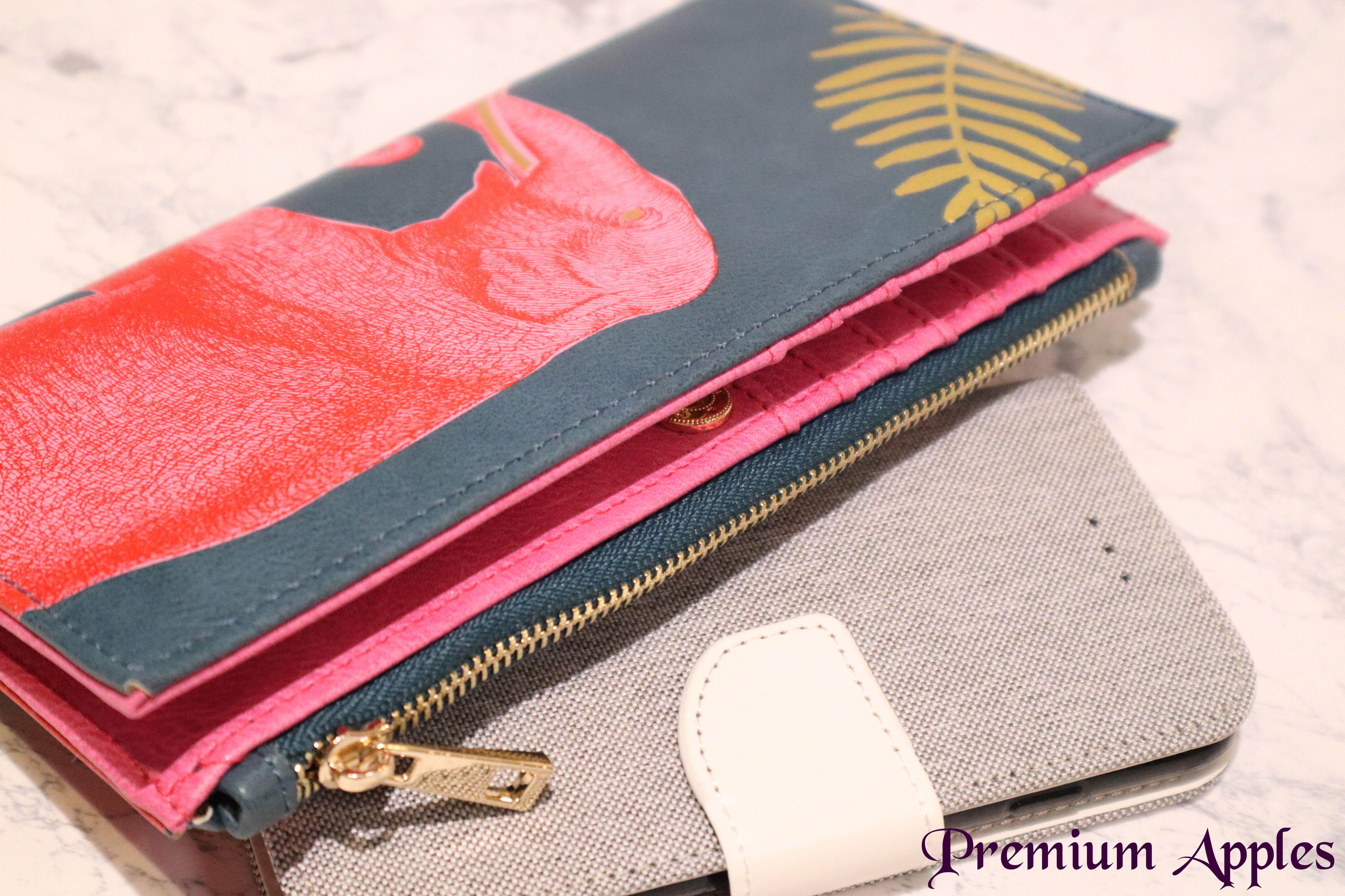 ピンクのカラーリングの内側には14のカード入れ、小銭入れ、2つのポケット付き。