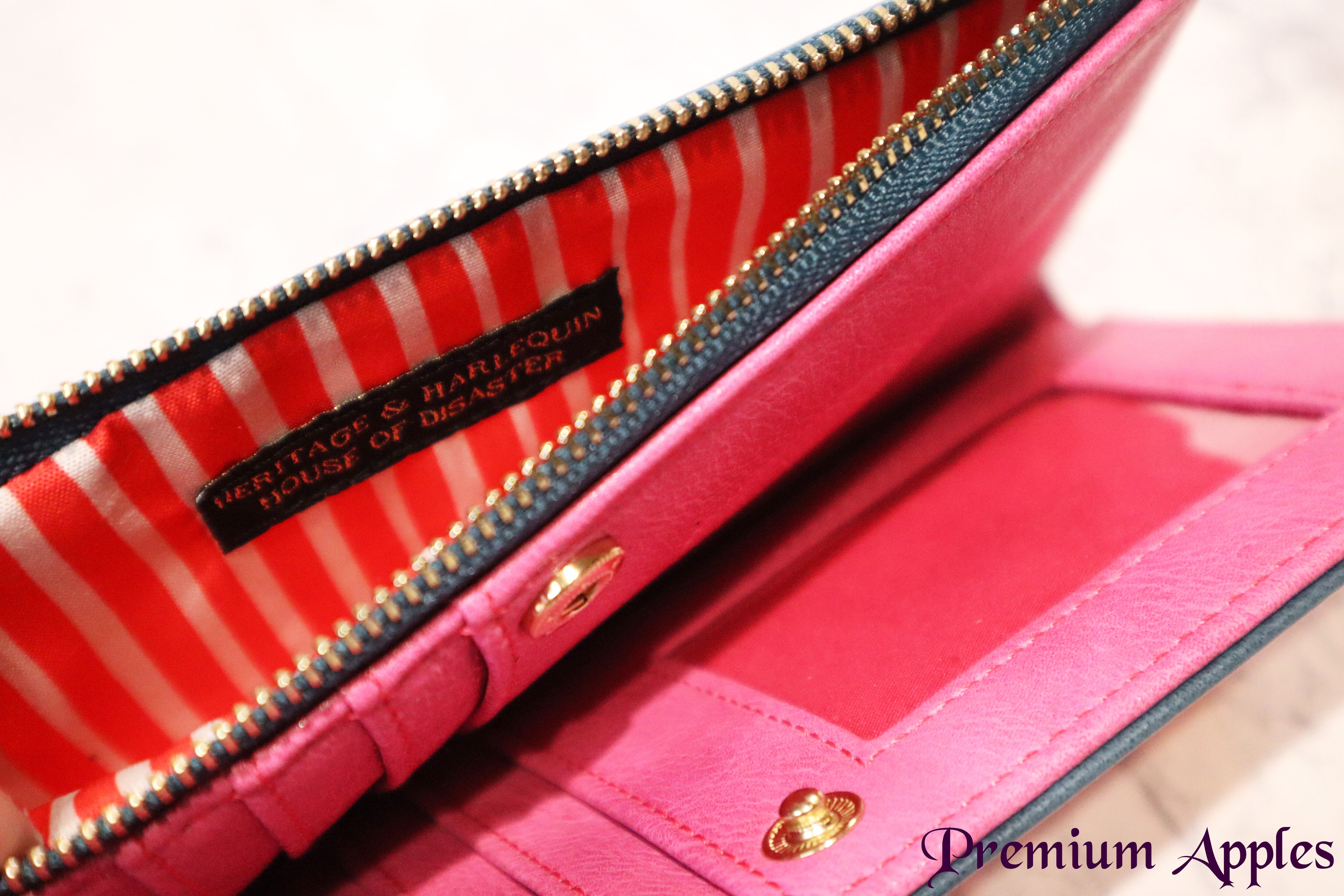 ピンクのカラーリングの内側には14のカード入れ、小銭入れ、2つのポケット付き。