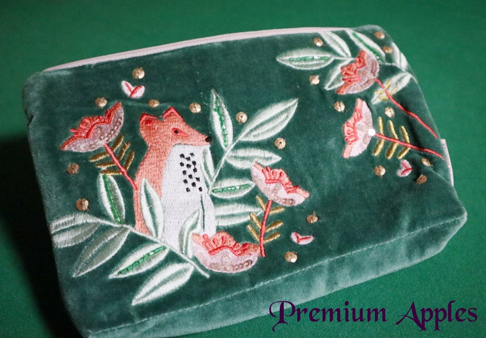 花の中に座っているキツネ、植物がゴールドのステッチとビーズで丁寧に装飾されています。2cmほどのマチがあるので少し厚みのある物も収納できそうです。